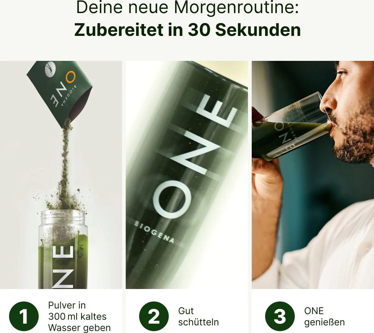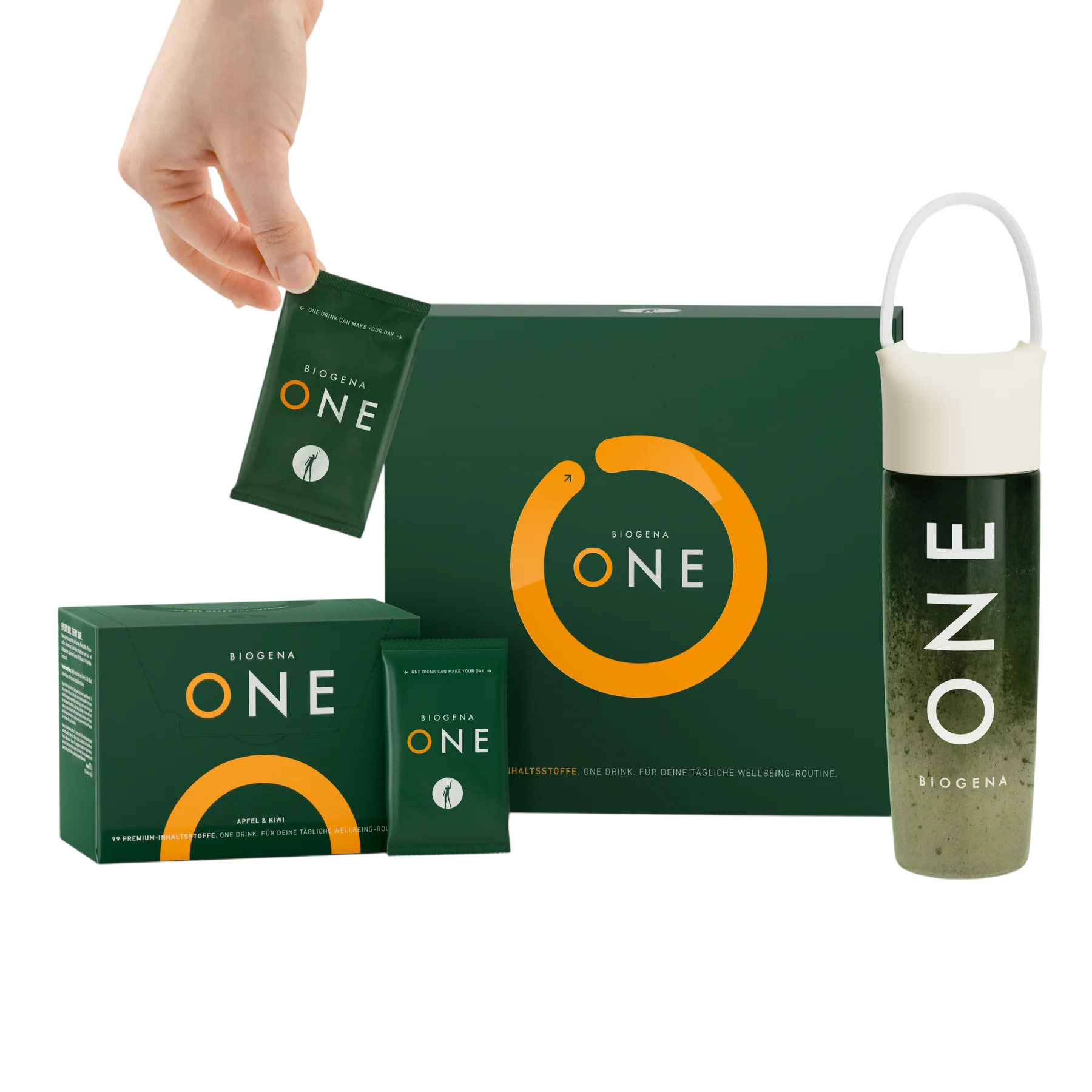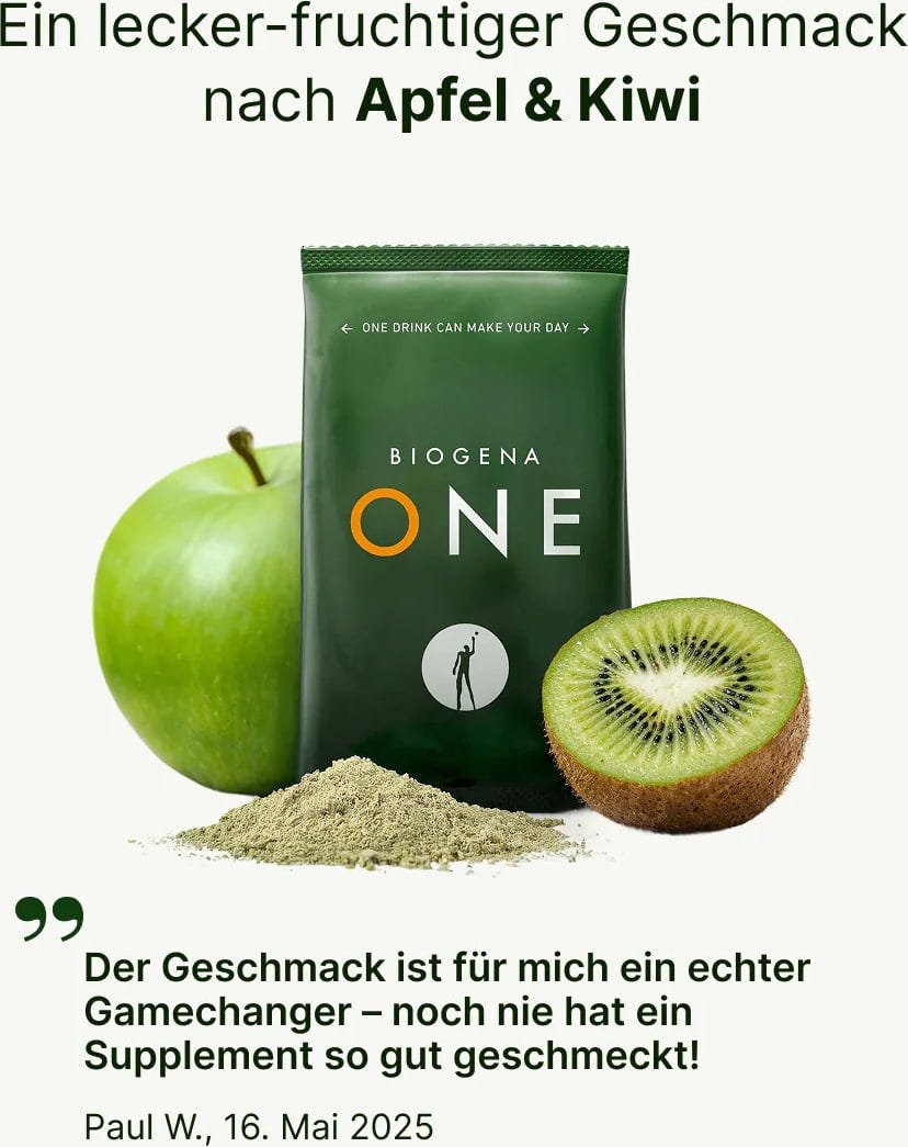 BIOGENA ONE ist ein Nahrungsergänzungsmittel in Form eines Getränks, das für die tägliche Nährstoffversorgung konzipiert wurde. Die Rezeptur setzt sich aus insgesamt 99 verschiedenen Inhaltsstoffen zusammen und verfolgt einen ganzheitlichen Ansatz bei der Auswahl der Rohstoffe. Das Geschmackserlebnis des Getränks wird durch eine Kombination aus Apfel, Kiwi und Gurke bestimmt, abgerundet durch die feine Note des Wasabi-Blattpulvers. Seine Nährstoffkombination umfasst verschiedene Stoffgruppen, die auf wissenschaftlicher Basis zusammengestellt wurden: