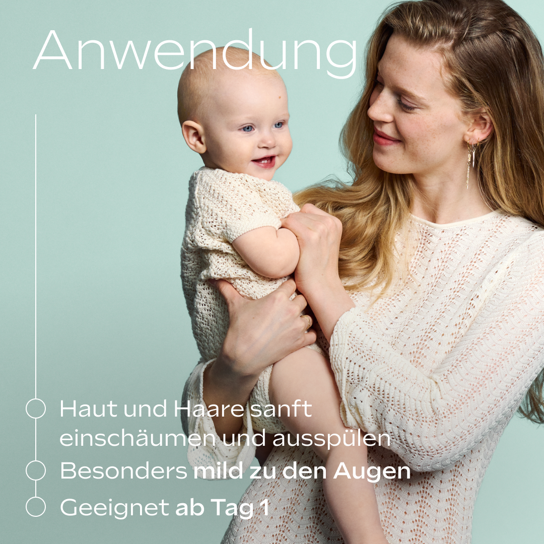 - Reinige die zarte Haut und das weiche Haar deines Babys sanft mit dem Produkt.