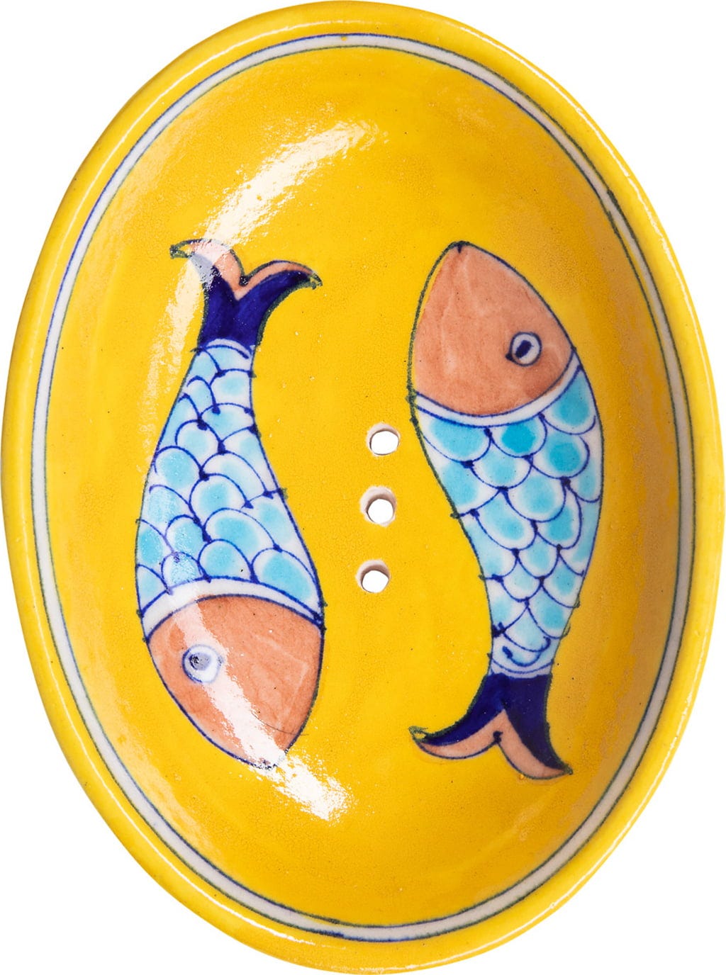 Mit dem Kauf dieser Seifenschale entscheidest du dich nicht nur für ein hübsches,f arbenfrohes Badaccessoire, sondern unterstützt gleichzeitig traditionelle Töpferkunst in Jaipur. Sie stammt aus einem Ort, an dem das Herstellen von Blue Pottery zur Lebensgrundlage gehört. Die Schale hat eine ovale Form und besitzt Löcher für den Wasserablauf - so kann deine Seife nach Gebrauch gut trocknen.