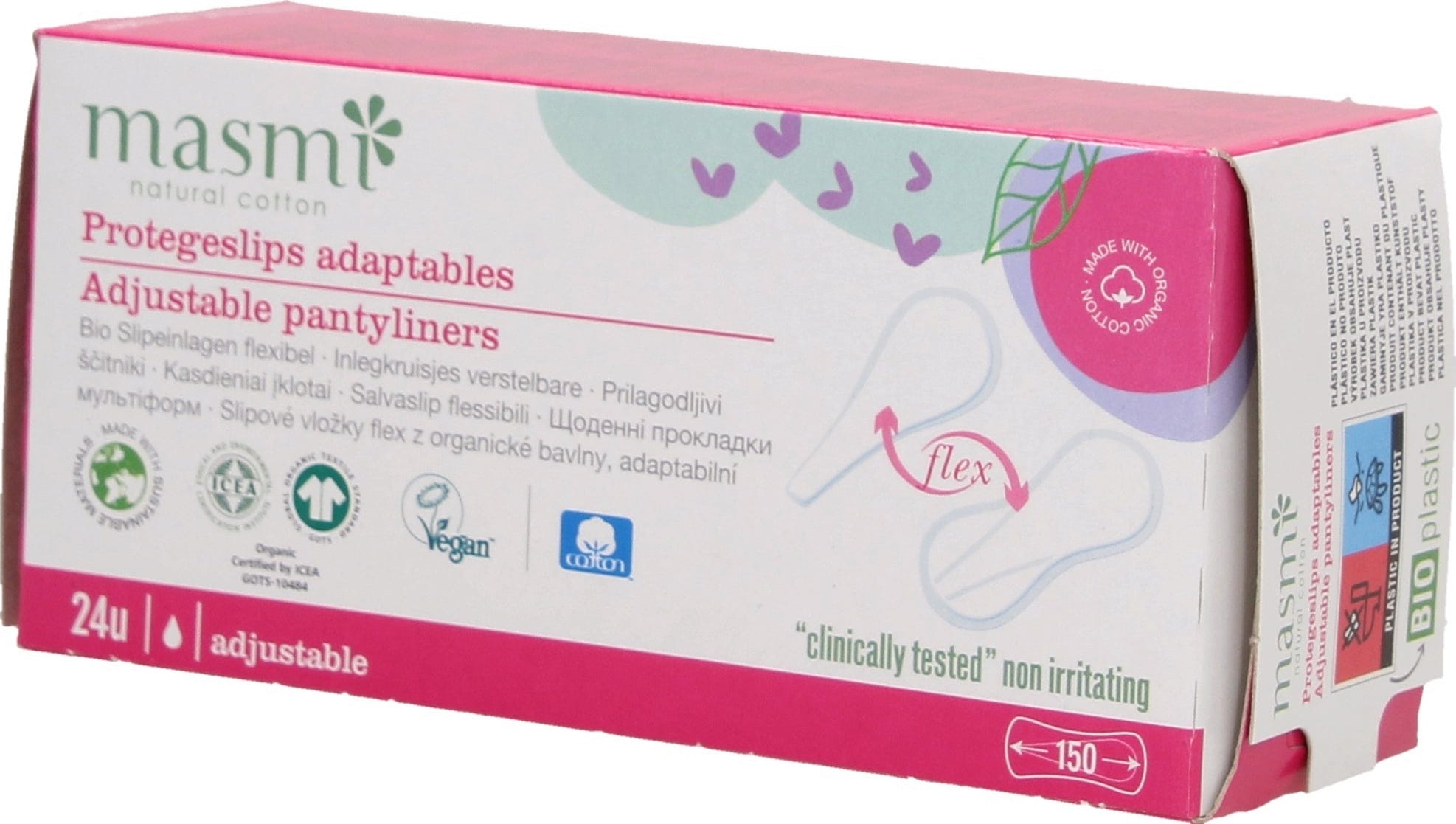 De Flex inlegkruisjes van masmi zijn gemaakt van 100% biologisch katoen. Vrij van synthetische stoffen en parfum, ademend en hypoallergeen. Onaangename geurtjes, huidirritatie en jeuk worden voorkomen. Deze inlegkruisjes zijn heel dun en kunnen zo worden gevormd dat ze in elk inlegkruisje passen. Een flinterdun katoenen gaasje voorkomt pluizen op de huid.