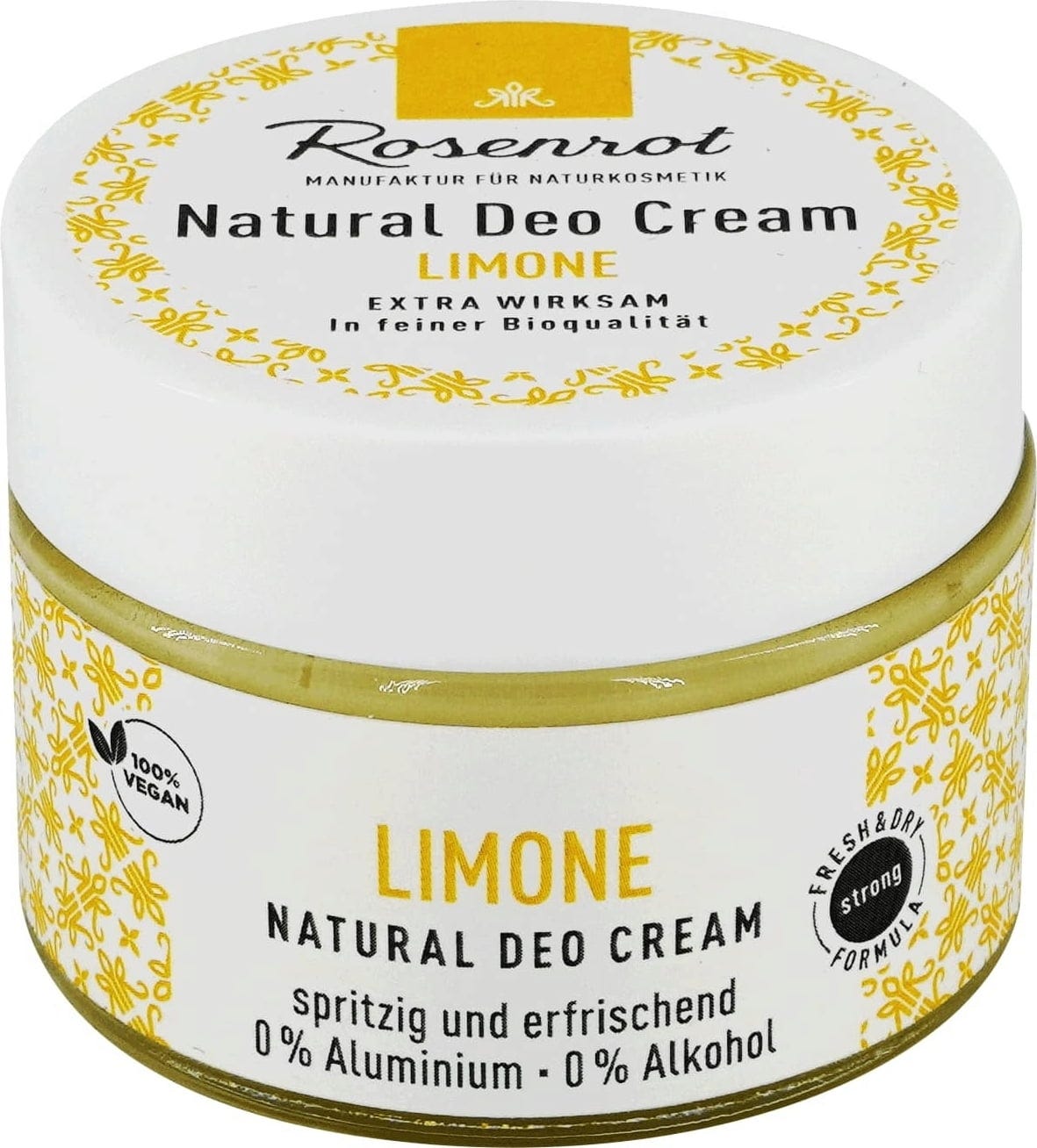 Rosenrot besteedt aandacht aan 100% natuurlijke stoffen, en gebruikt natriumbicarbonaat, ofwel zuiveringszout, in de deodorantcrème als doeltreffende bescherming tegen transpiratie. De verzachtende en hydraterende eigenschappen worden geleverd door de karitéboter en de kokosolie. De verschillende geuren bieden voor elk wat wils, en dankzij het praktische formaat past de deodorant crème perfect in je weekendtas.