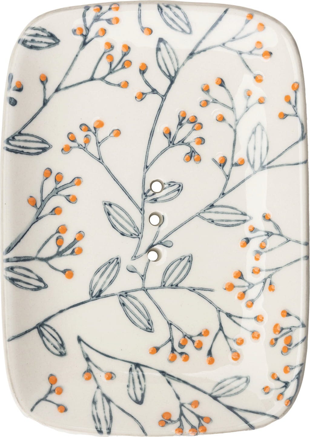 Dit zeepbakje van hoogwaardig aardewerk is met de hand gestempeld met een filigraanprint en heeft gaatjes voor de afvoer van water. Zo kan de zeep na elk gebruik goed drogen.