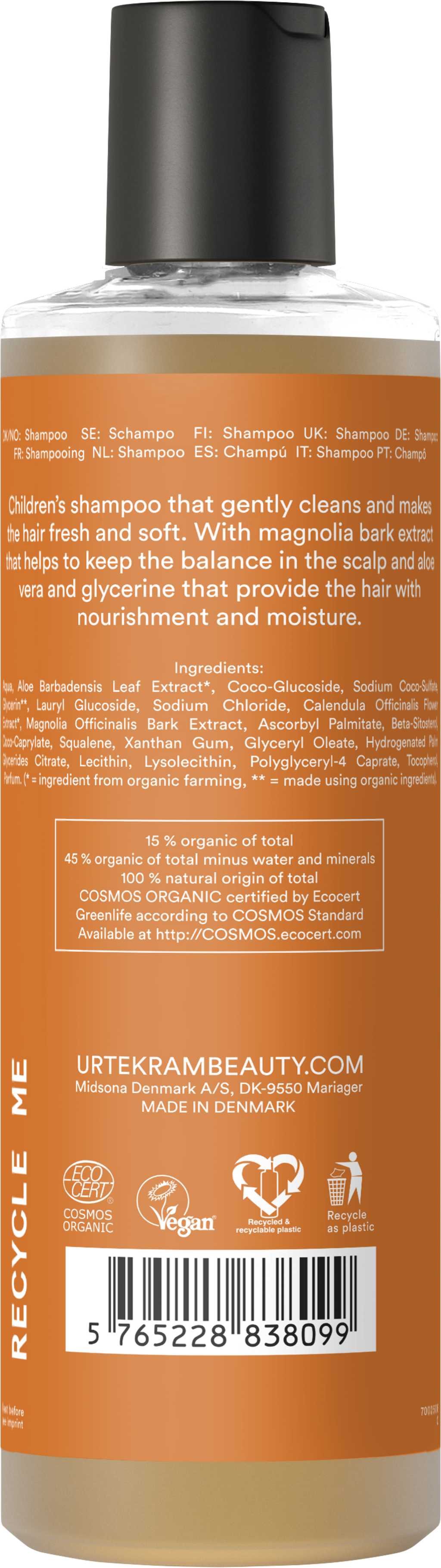 Deze shampoo maakt kinderhaar schoon en zacht. Magnolia schorsextract en goudsbloem zorgen voor extra balans van de hoofdhuid, terwijl aloë vera, glycerine en plantaardig squalaan het haar hydrateren.