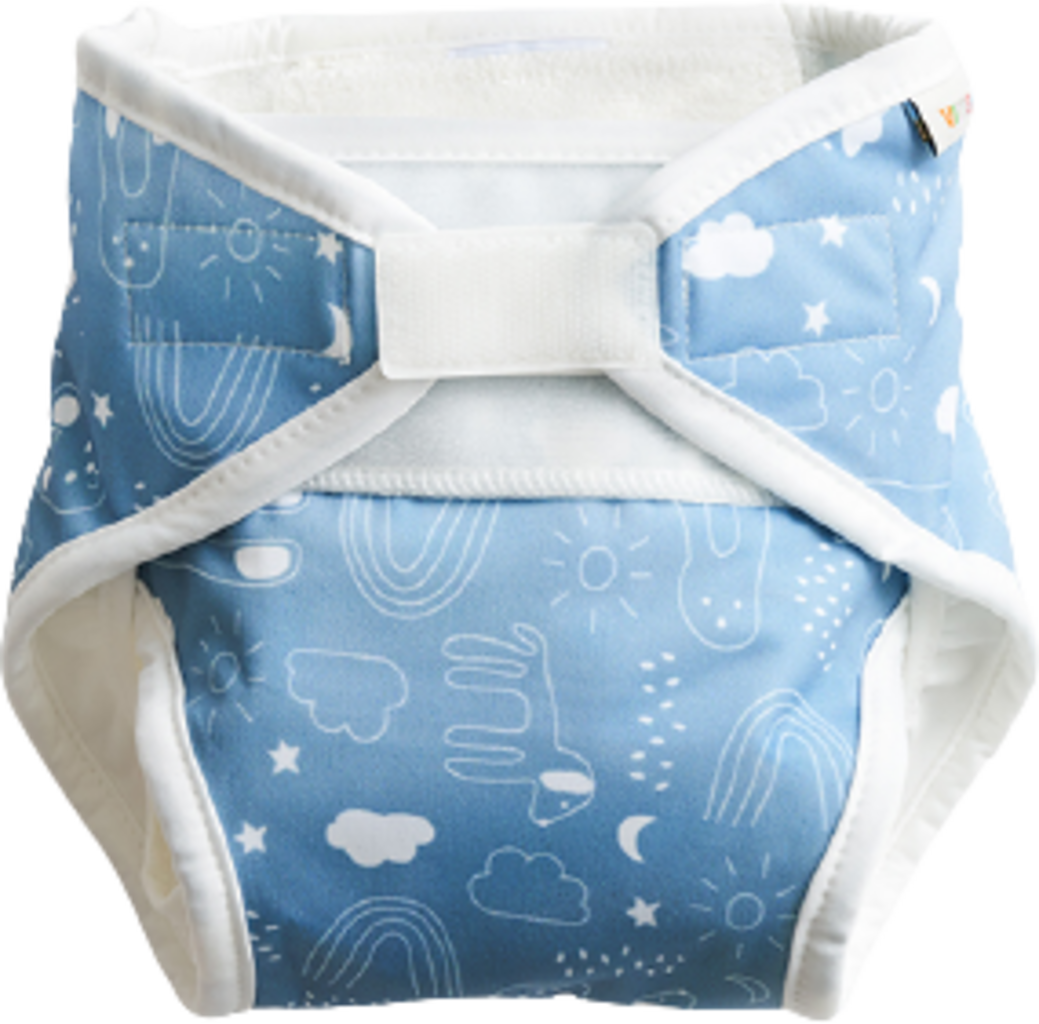 De one size luierovertrek groeit met je baby mee en is geschikt voor een gewicht van 4-16 kg. De zachte klittenbandsluiting en drukknopen zorgen voor een perfecte pasvorm, die gemakkelijk kan worden aangepast aan de leeftijd en grootte van de baby. De luierovertrek bestaat uit twee lagen waterafstotend PUL.