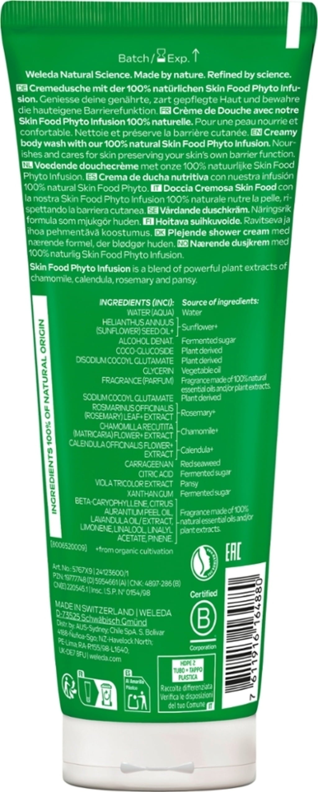 De aangename textuur, de zachte schuim en de Skin Food Phyto Infusion met extracten van kamille, calendula, rozemarijn en viooltje maken deze douchecrème tot een verwennende ervaring. Ze biedt voedende eigenschappen en behoudt de natuurlijke beschermfunctie van de huid. Voor een schone en verzorgde huid.